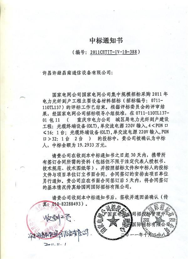 昌南公司中標2011年電力光纖到戶工程國家電網公司集中采購中重慶地區(qū)