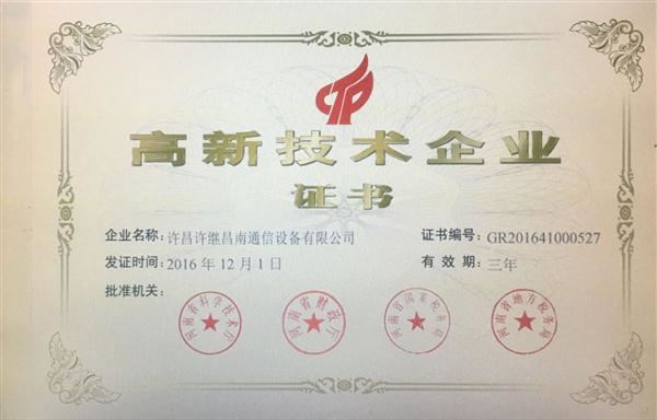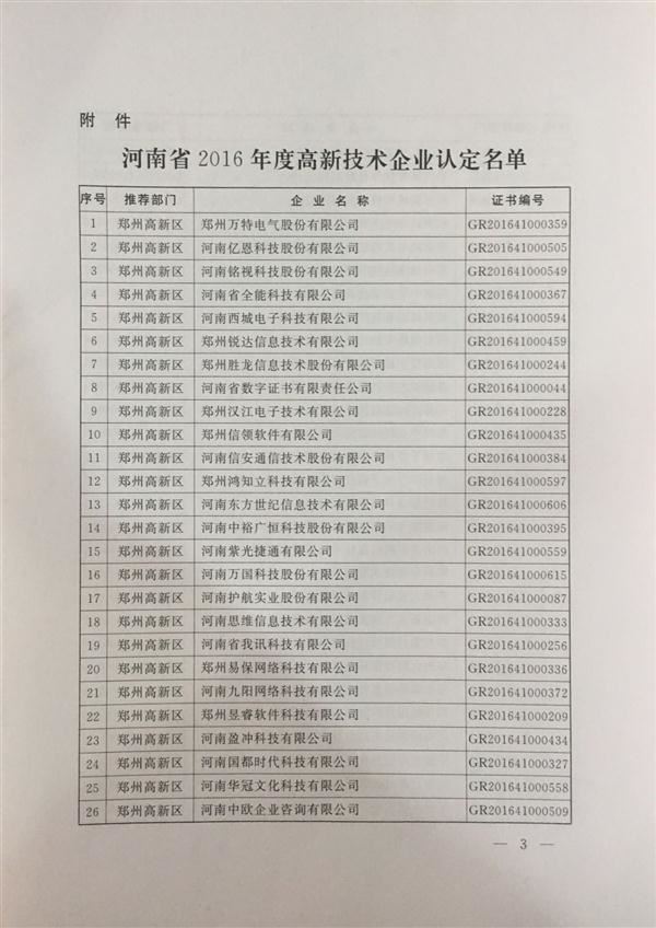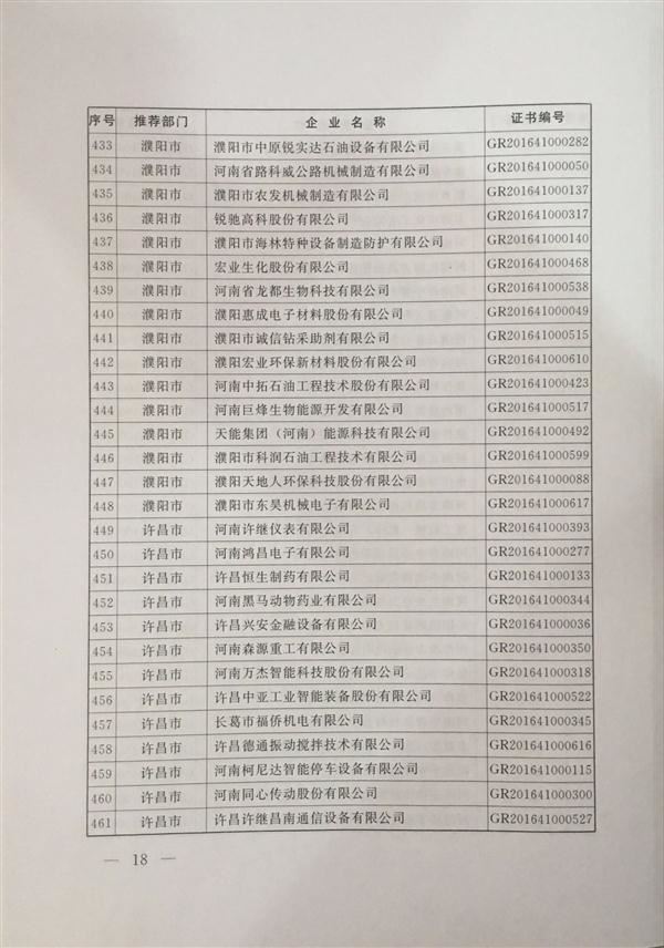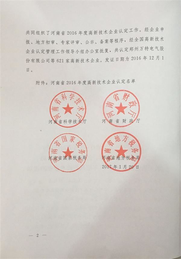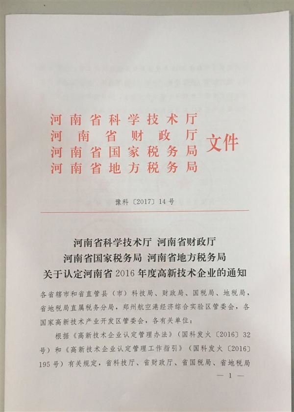 經(jīng)河南省科學技術廳、河南省財政廳、河南省國家稅務局、河南省地方稅務局組織認定,并報全國高新技術企業(yè)認定管理工作領導小組辦公室備案批復,公司于2016年12月被正式認定為2016年度國家高新技術企業(yè)。