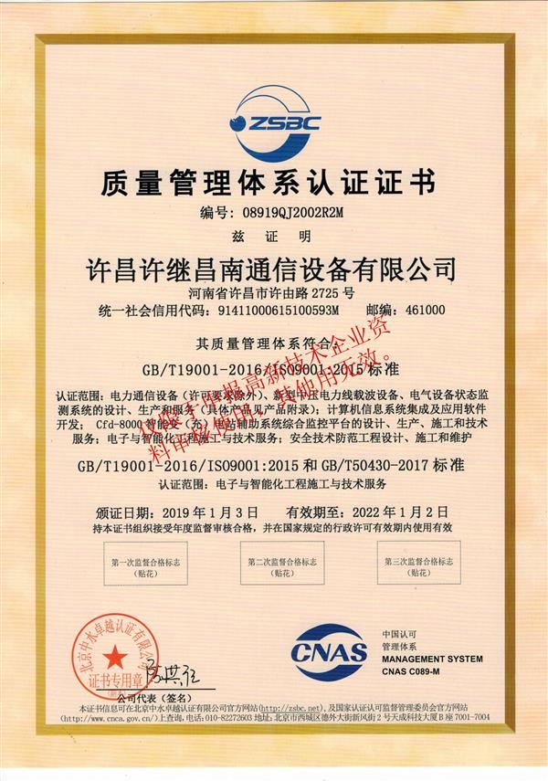 質(zhì)量管理體系認(rèn)證證書