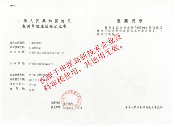 海關(guān)報關(guān)單位注冊登記證書